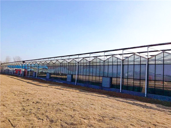 采用熱鍍鋅鋼制骨架,覆蓋材料為5mm鋼化玻璃,透光率在九十以上。溫室大棚頂部及四周為專用鋁型材。溫室大棚頂部為雙向開窗,齒輪齒條副傳動。根據用戶需要,溫室大棚兩個端面可安裝濕簾和風機,也可在兩個端面及側面安裝鋁型材推拉窗、平開窗或外翻窗。